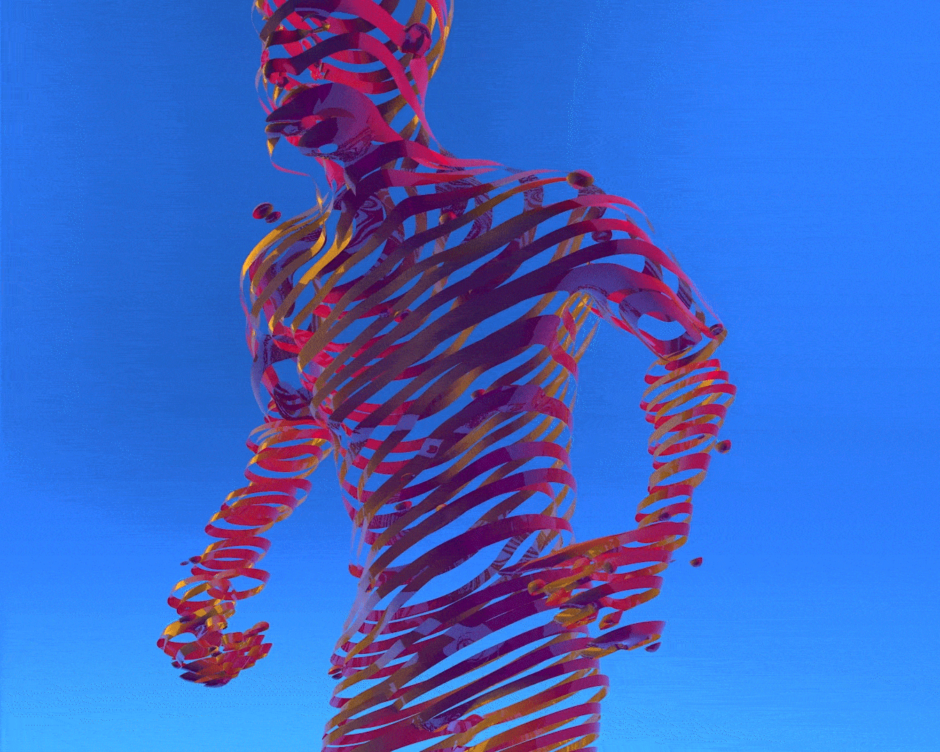 I came up with the idea of turning the medal ribbon into strands that would cover a running human figure. With that in mind, I used C4D for the 3D motion and After Effects to overlay key text phrases onto the live footage.